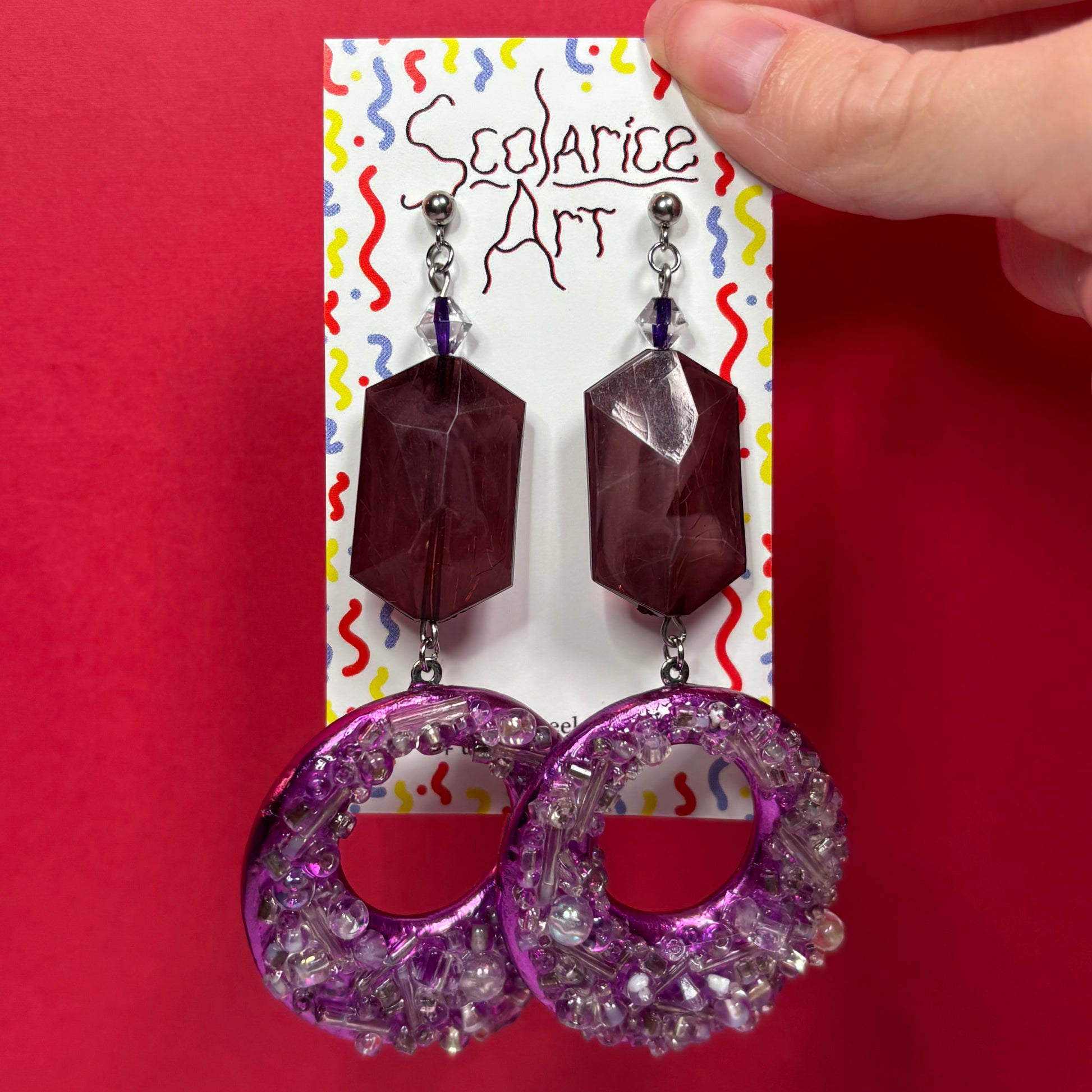 Features a clear bicone bead with a purple streak in the middle, a dark purple oblong faceted hexagon bead, and a purple mod hoop with clear beads on top in different textures and shapes.