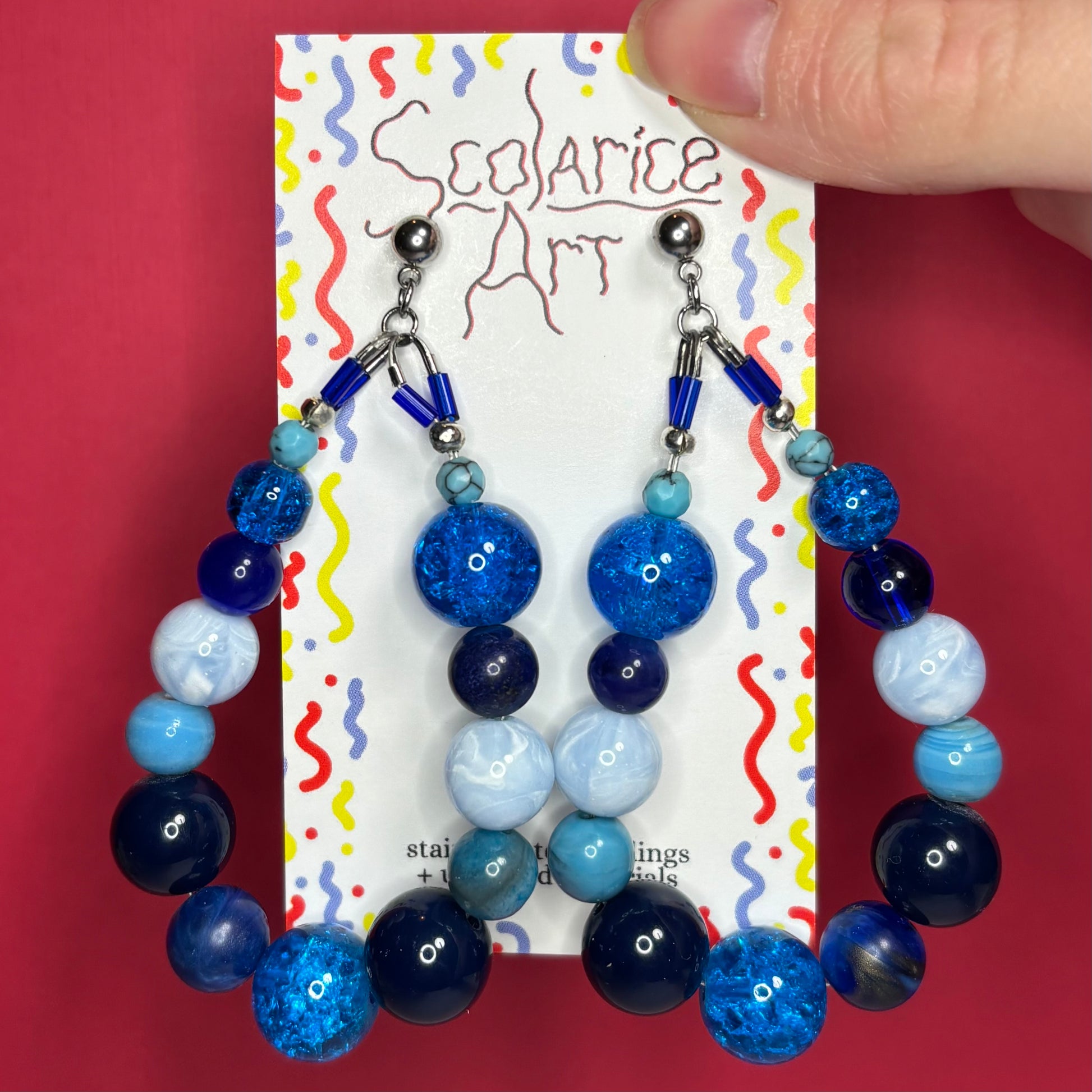 Features a hoop of round beads in various sizes, textures, and shades of blue. In the center hangs a fake light blue safety pin.