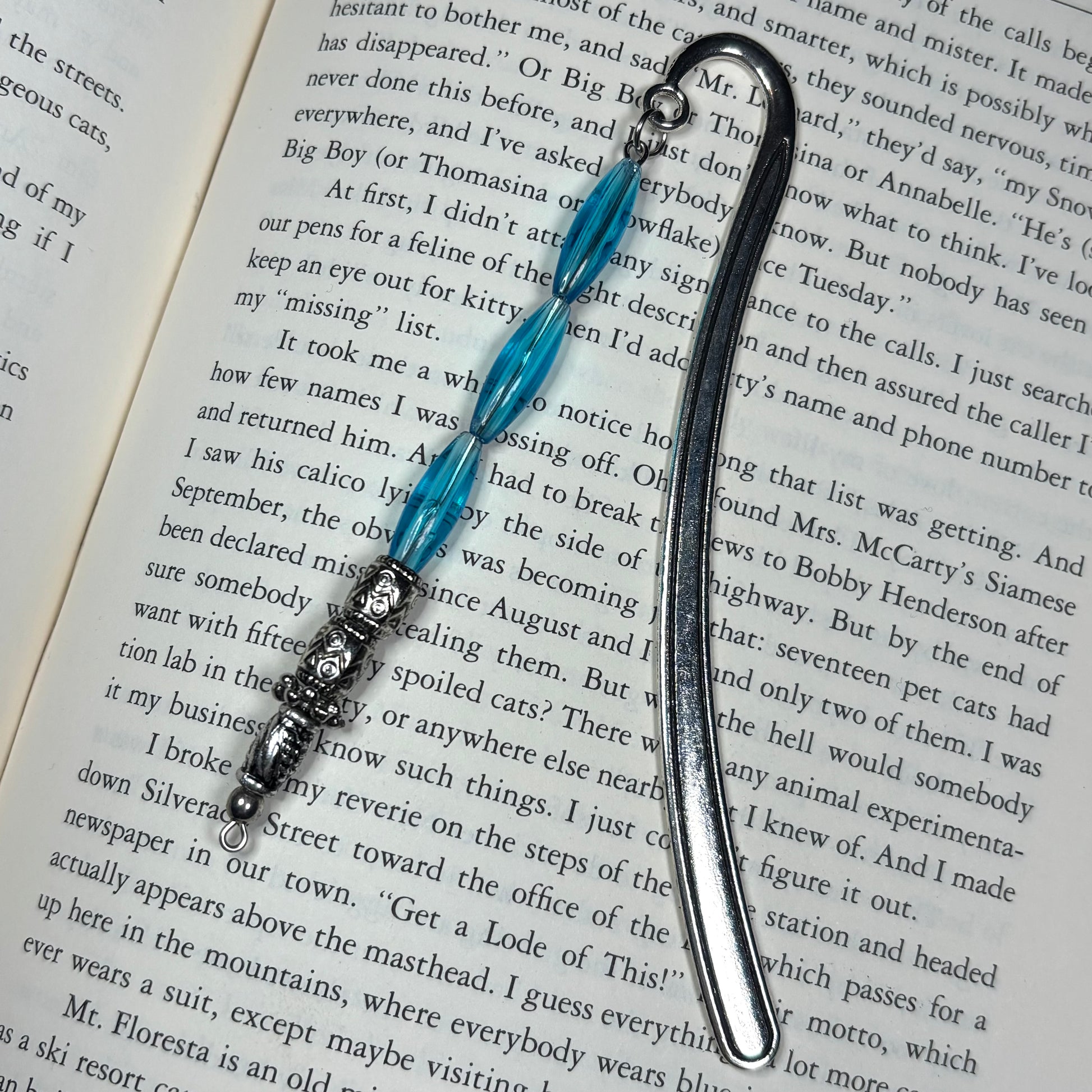 Features a plain bookmark hook with a strand containing three clear blue tapered oval beads, two silver cylinder beads with etched designs, a silver burst bead, a silver tapered cylinder bead with etched designs, and a silver round bead.