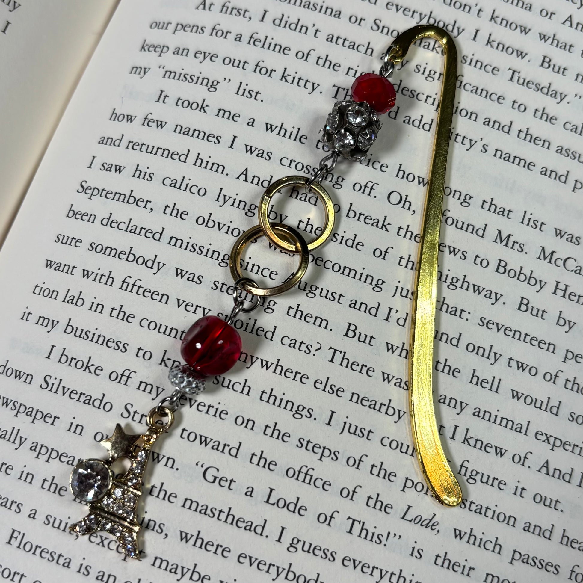 Features a plain bookmark hook with a strand containing a red faceted rondelle bead, a silver rhinestoned round bead, two interlaced gold hoop charms, a clear red round bead, a small silver rhinestoned rondelle bead, and a gold charm of an Eiffel tower with rhinestones.