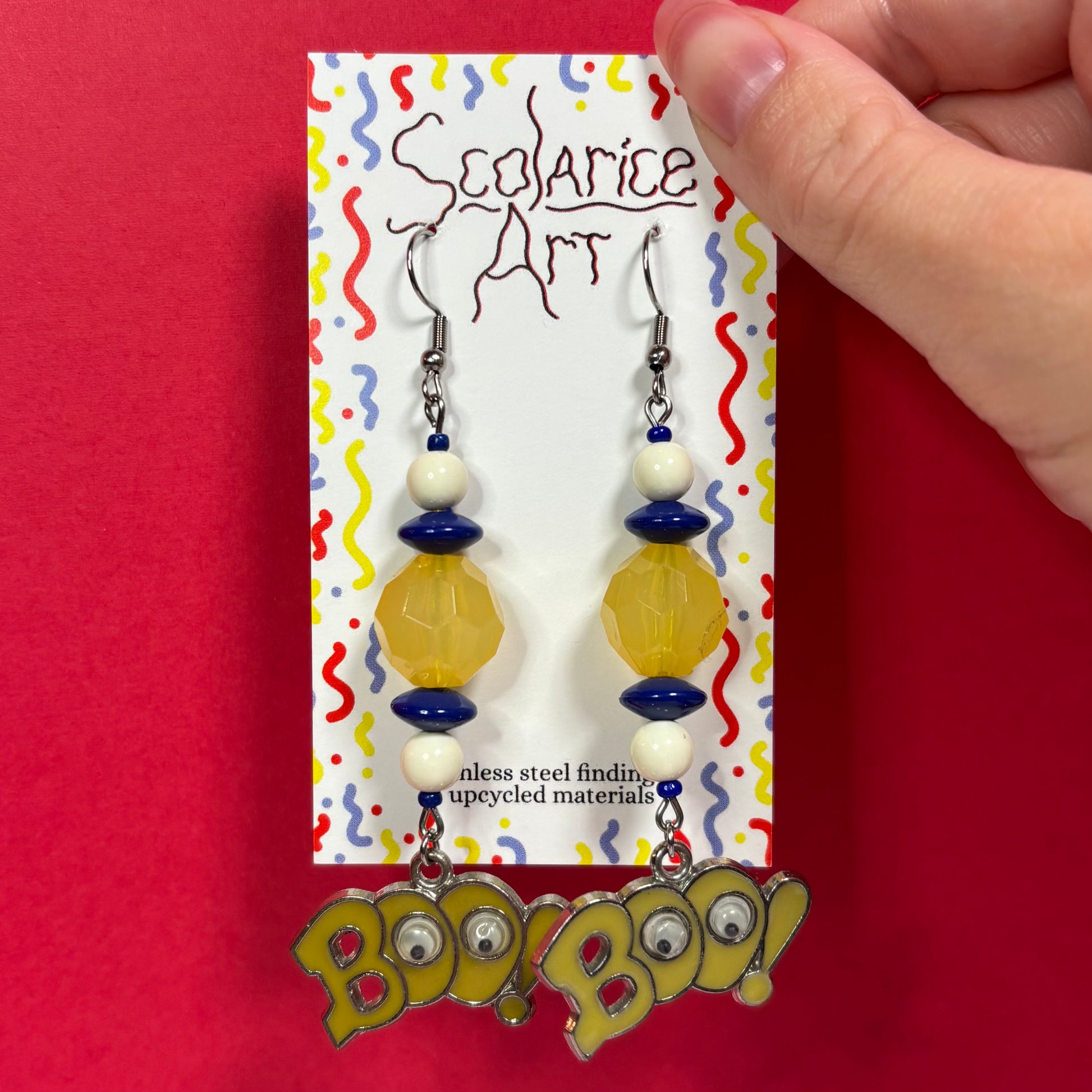 Features a dark blue seed bead, an off-white round bead, a dark blue disk bead, a yellow faceted round bead, a dark blue disk bead, an off-white round bead, a dark blue seed bead, and a silver metal charm with a yellow enamel spelling out "BOO!" with two google eyes where the O holes are.