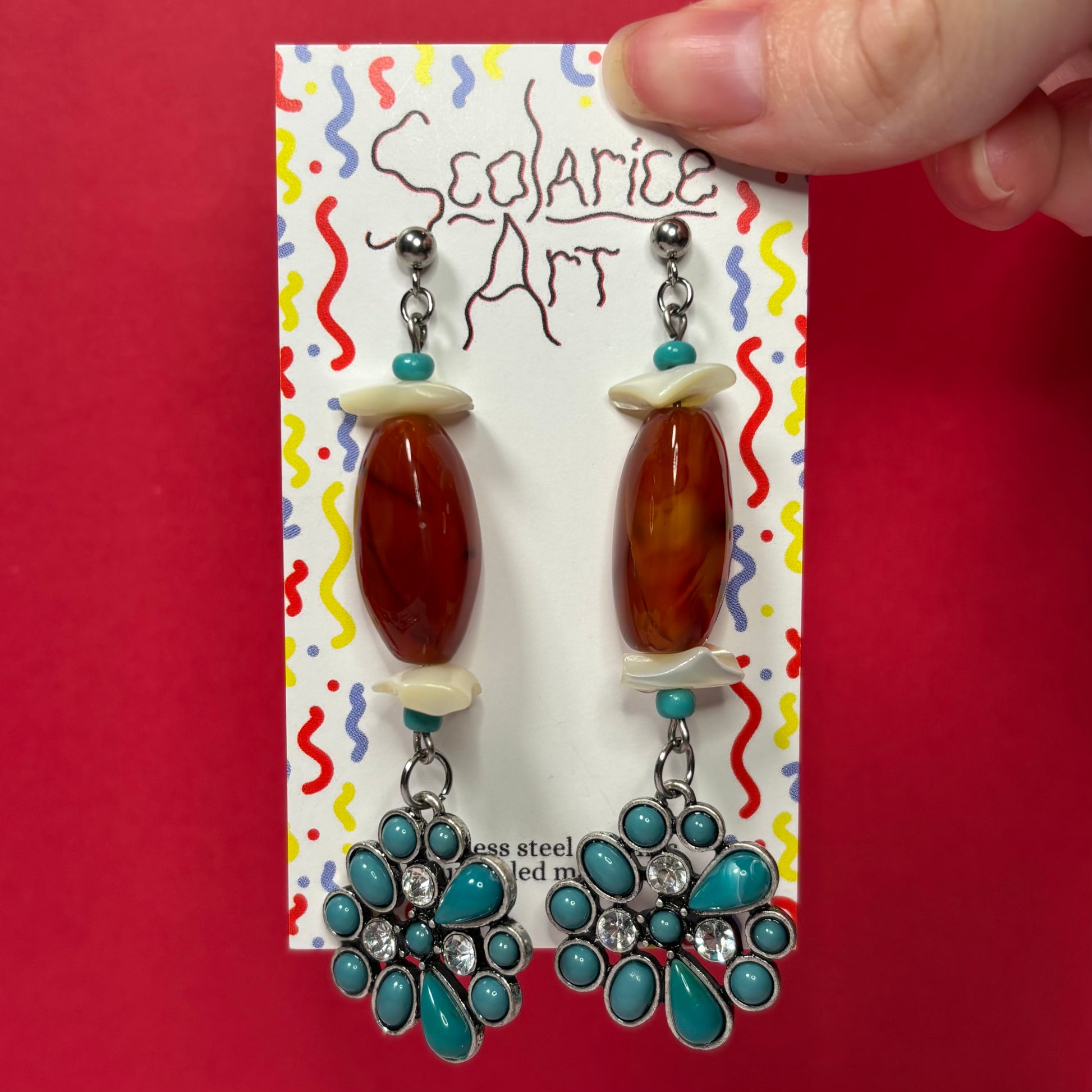 Features a small aqua seed bead, a pearly flat misshapen bead, a large dark red ovular bead, a pearly flat misshapen bead, a small aqua seed bead, and a silver charm of several ovals and circles with blue inlets and three large silver rhinestones, assembled in a burst-like pattern.