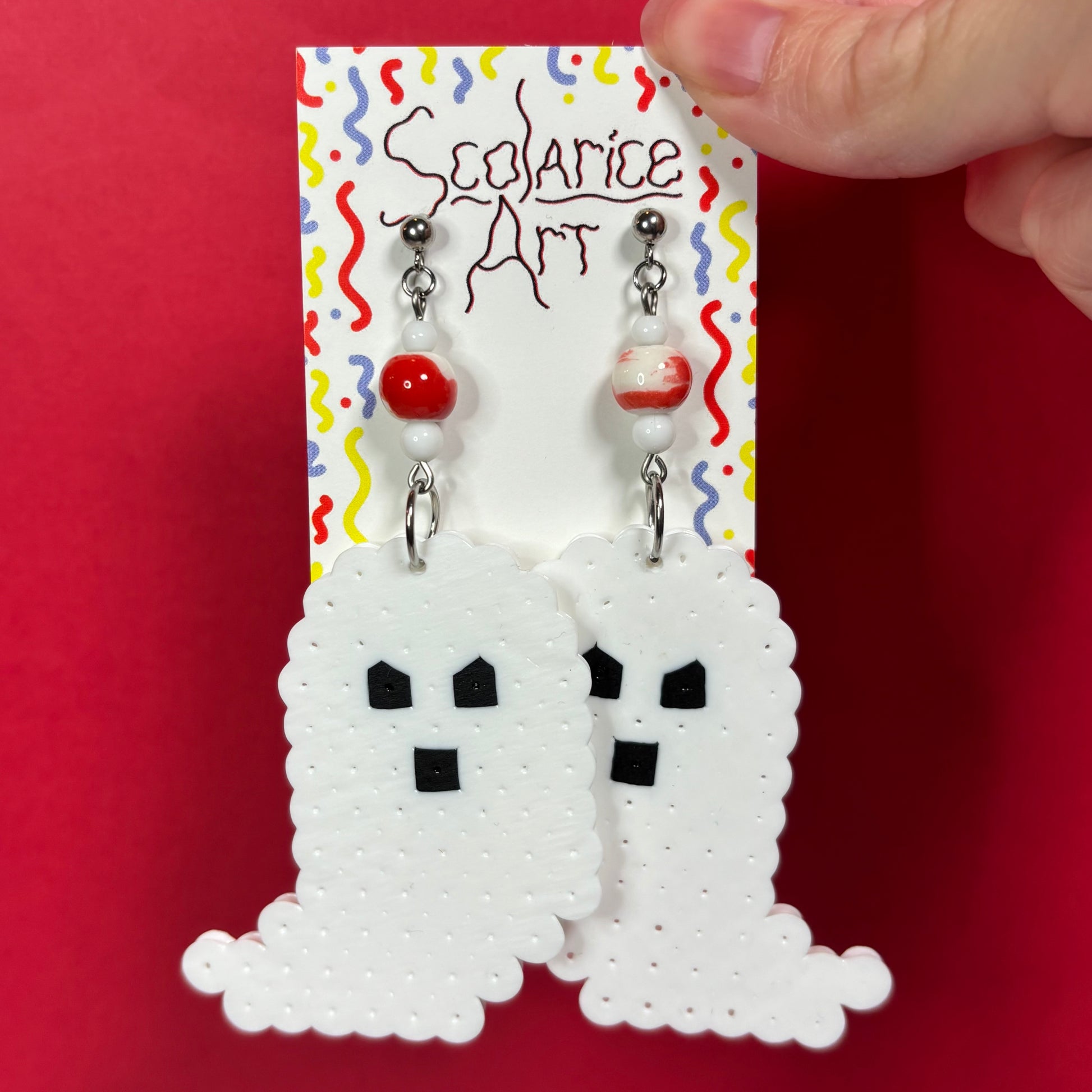 Features a white seed bead, a white and red swirled round bead, a white seed bead, and a large Perler pixel art of a white ghost with black dot eyes and mouth.