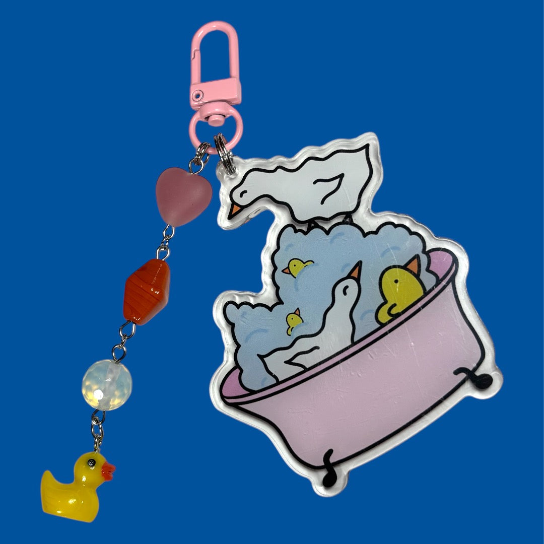 "Goose Bath" features a pink claw foot bathtub with light blue bubbles piled high inside. In the tub is a white goose and 3 yellow rubber duckies. On top of the bubbles is another white goose.