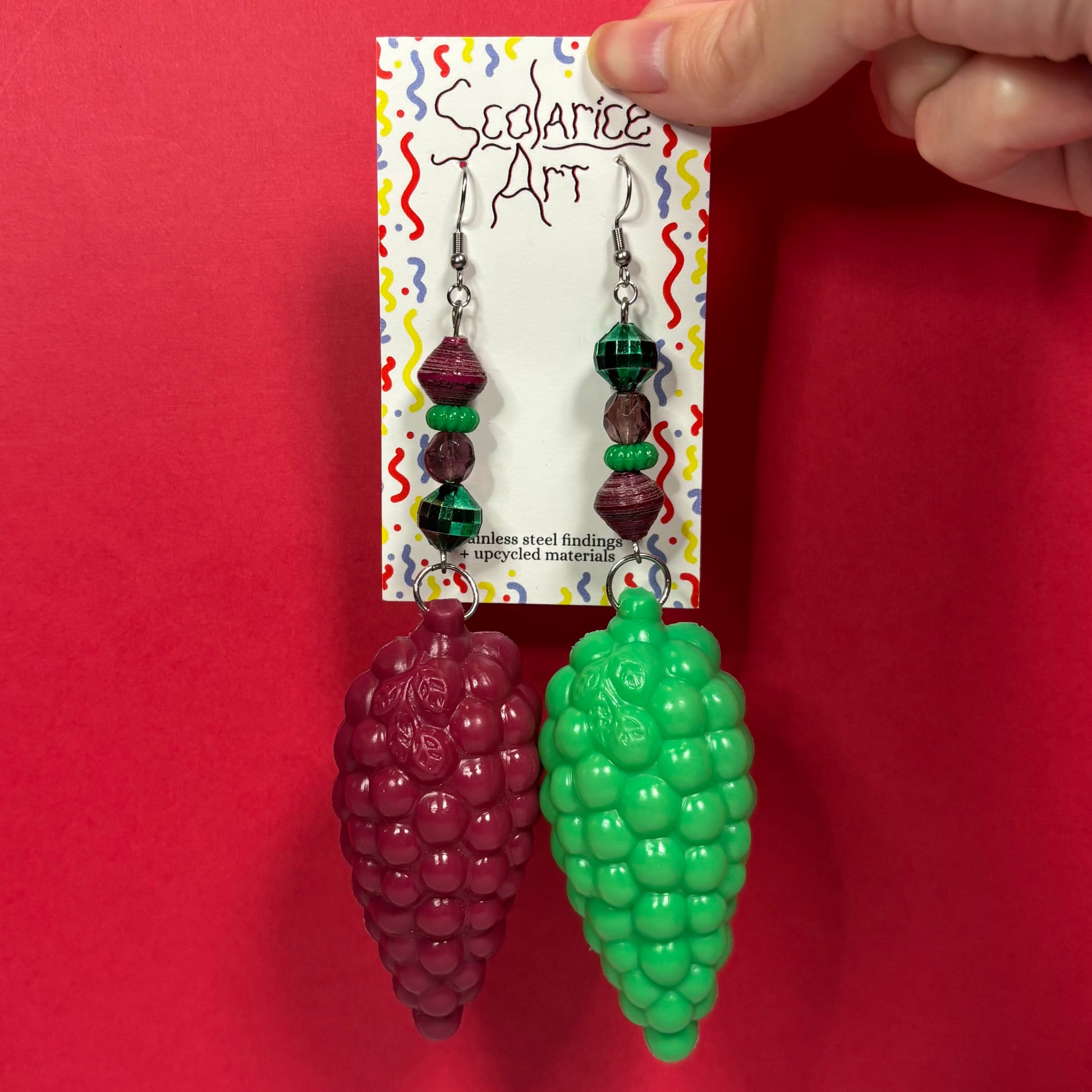 One earring features a textured purple cone-like bead, a textured green disk bead, a purple faceted round bead, a dark green faceted bicone bead, and a large purple grape bunch toy charm.