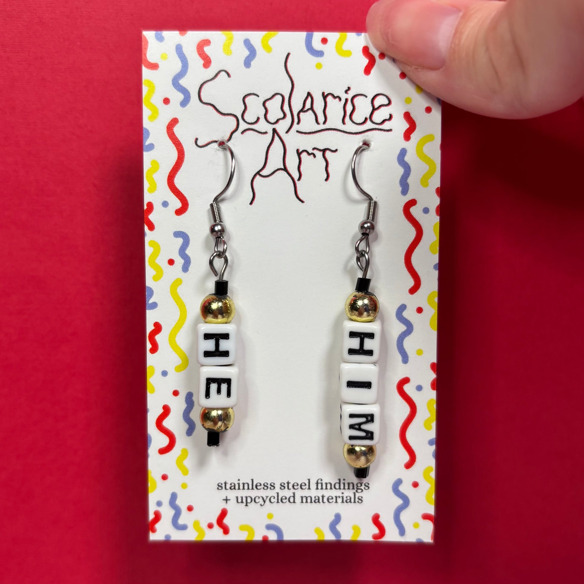 Features a mismatched pair. Both earrings have a small black seed bead, a gold round bead, white cube beads with black uppercase letters, a gold round bead, and a small black seed bead. One earring spells out "HE" and one earring spells out "HIM".