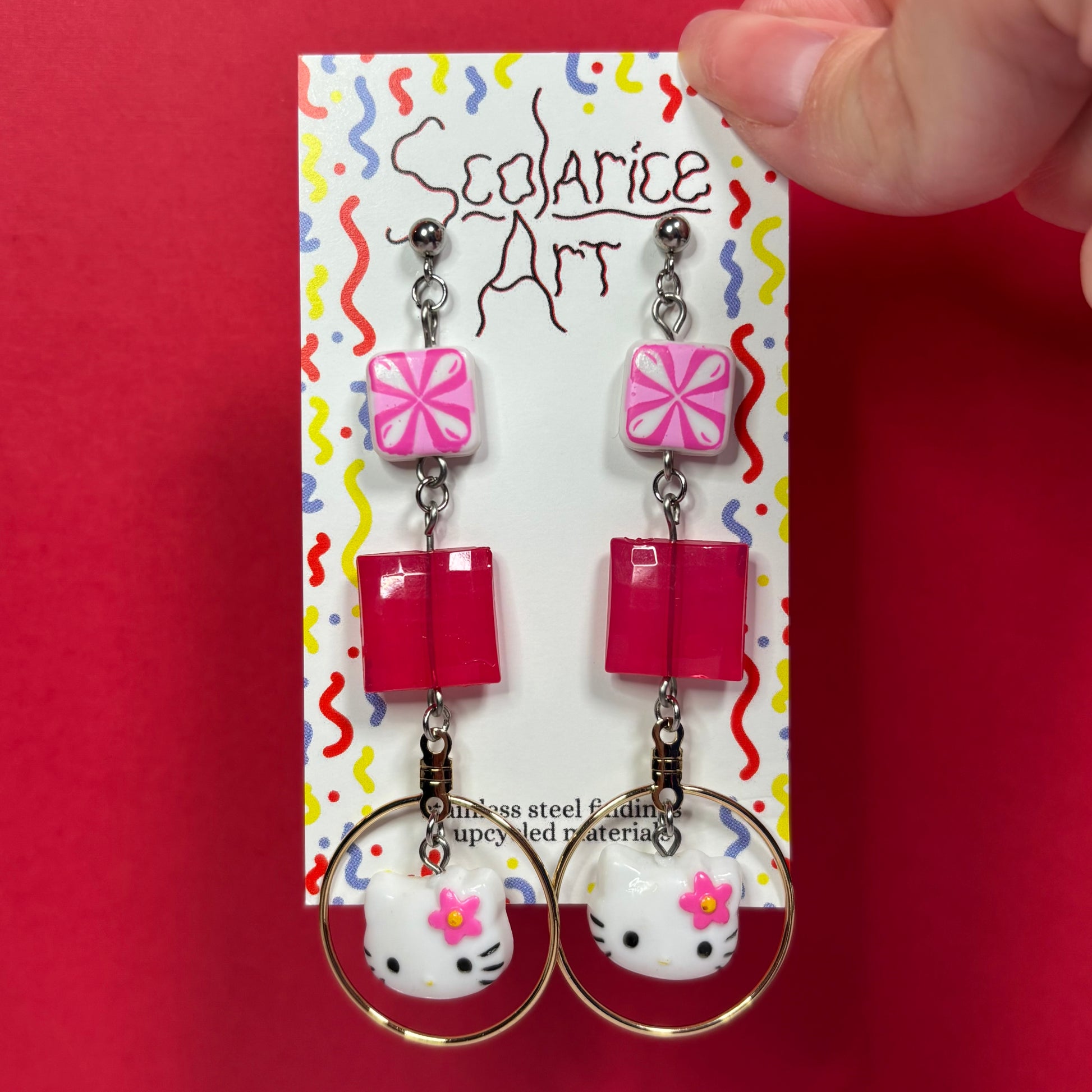 Features a white flat square bead with a white and pink burst detail, a dark pink flat square bead, and a gold thin hoop charm with a white Hello Kitty head hanging in the middle wearing a pink five-petal flower with a yellow center.