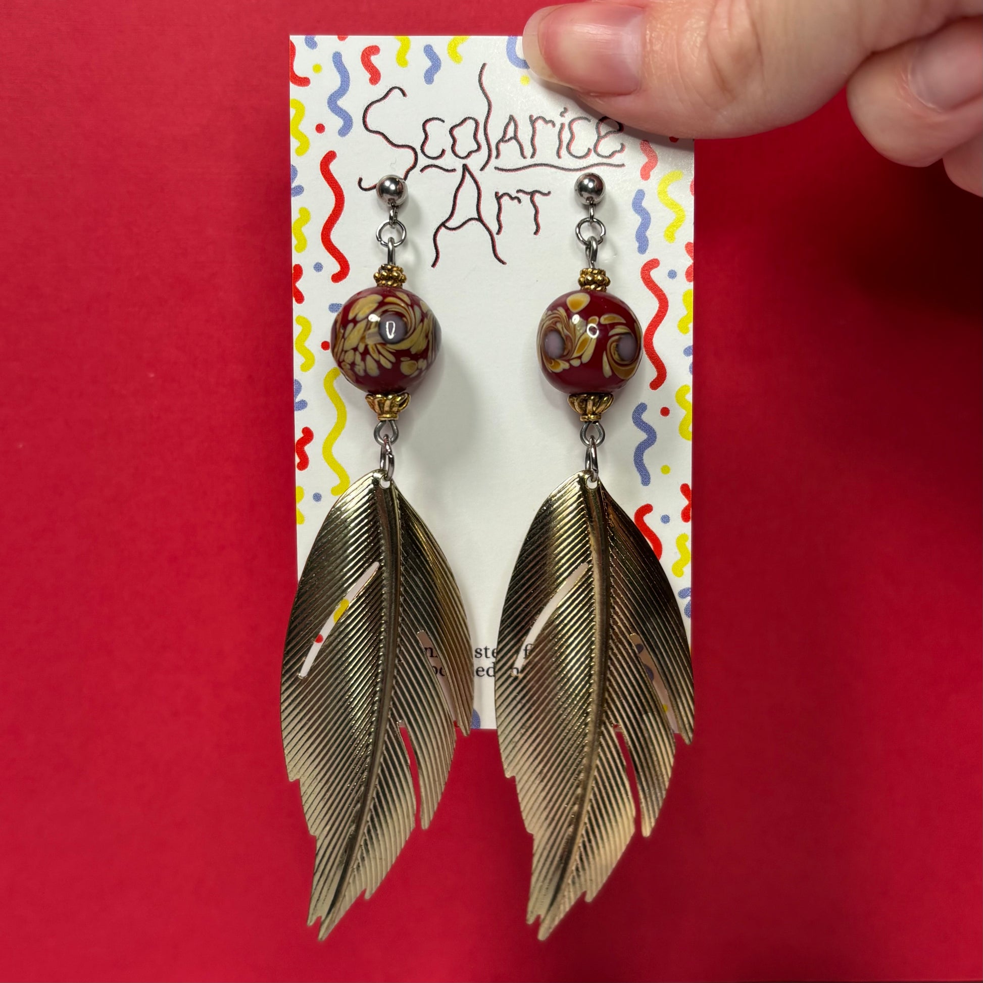 Features a small gold textured bicone bead, a large red round bead with details of yellow and purple bursts, a gold cap bead, and a large ridged feather charm.