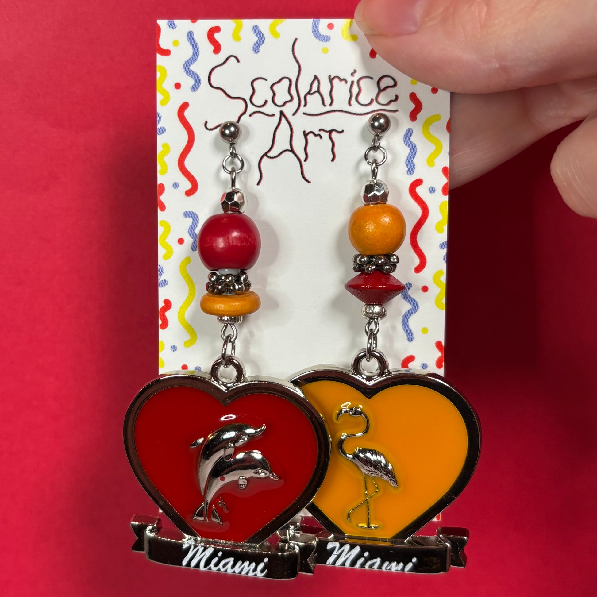 One earring features a silver faceted round bead, a red round bead, a textured silver disk bead, an orange disk bead, and a silver heart with a red inlet and two silver dolphins in the middle, with a silver banner at the bottom with "Miami" in white text.