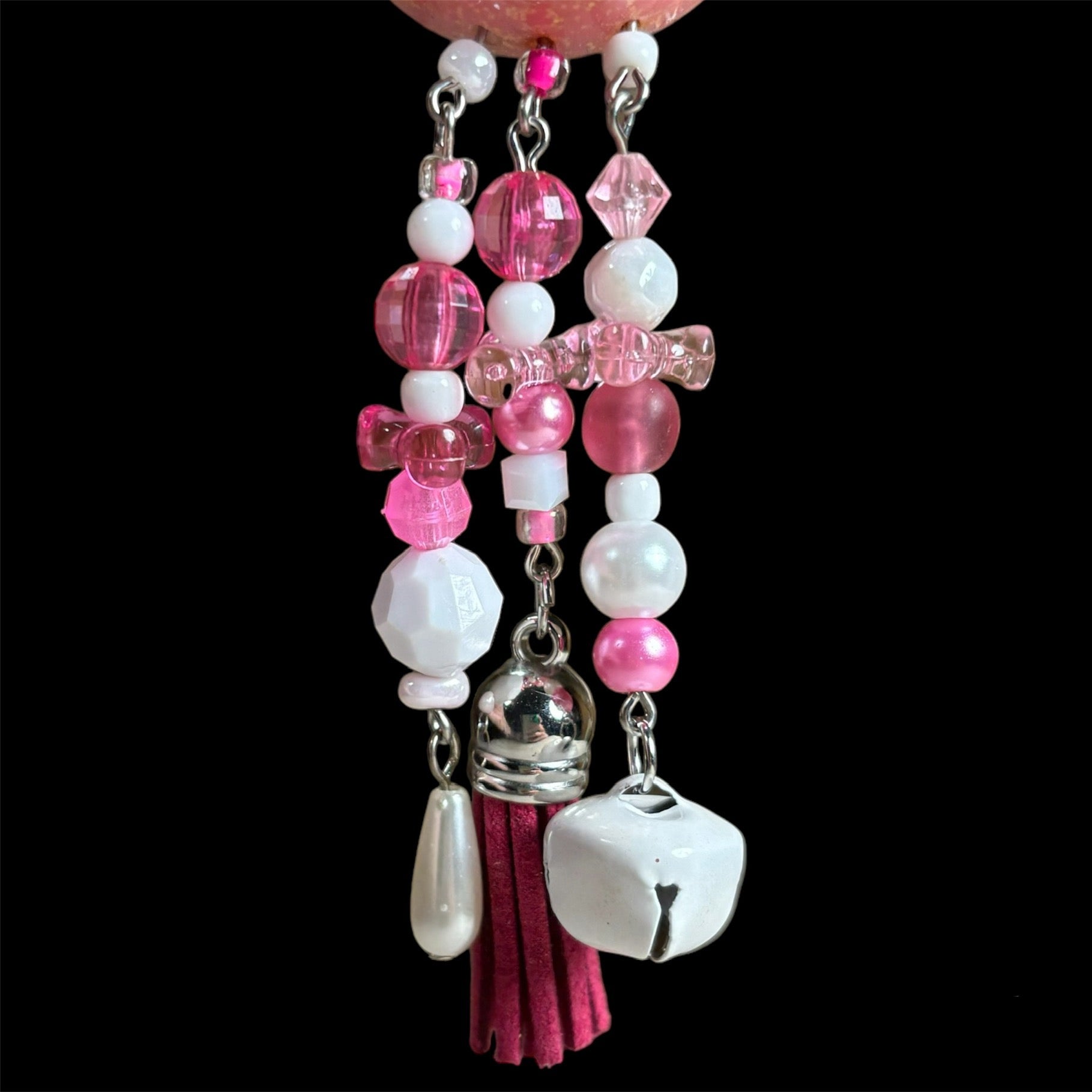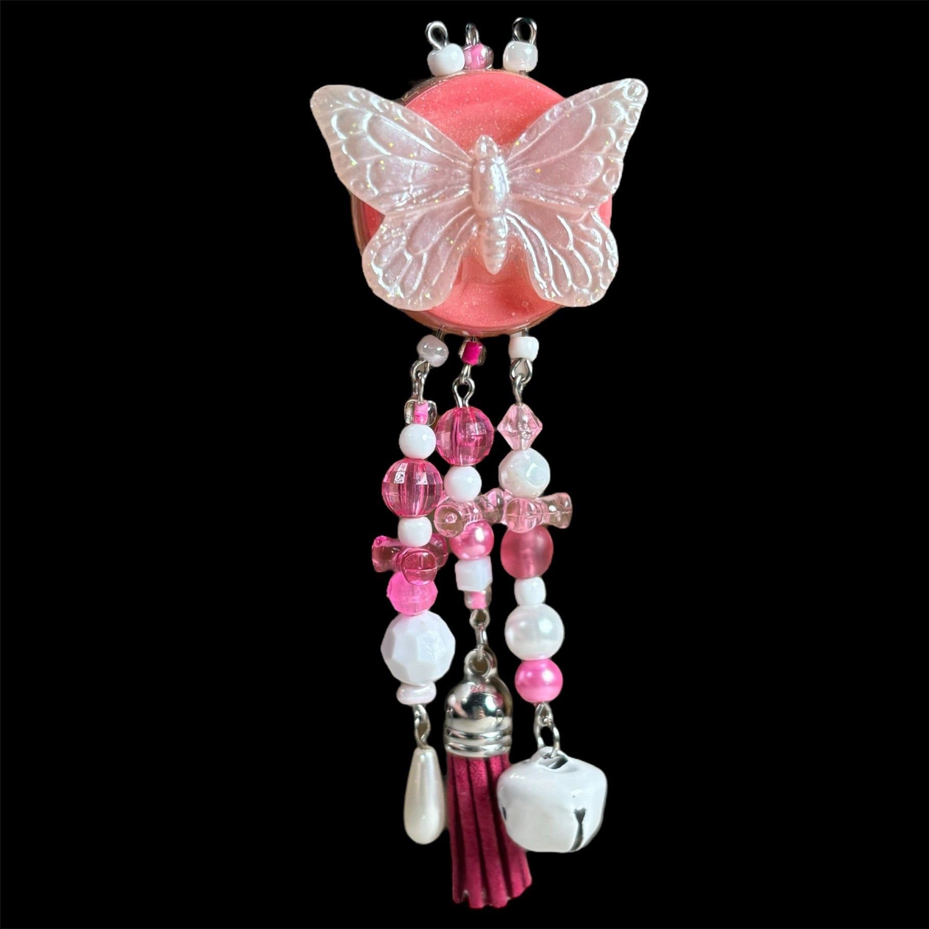 A round pink base with a pearly white butterfly, with three strands hanging from the bottom with various white and pink beads and charms.