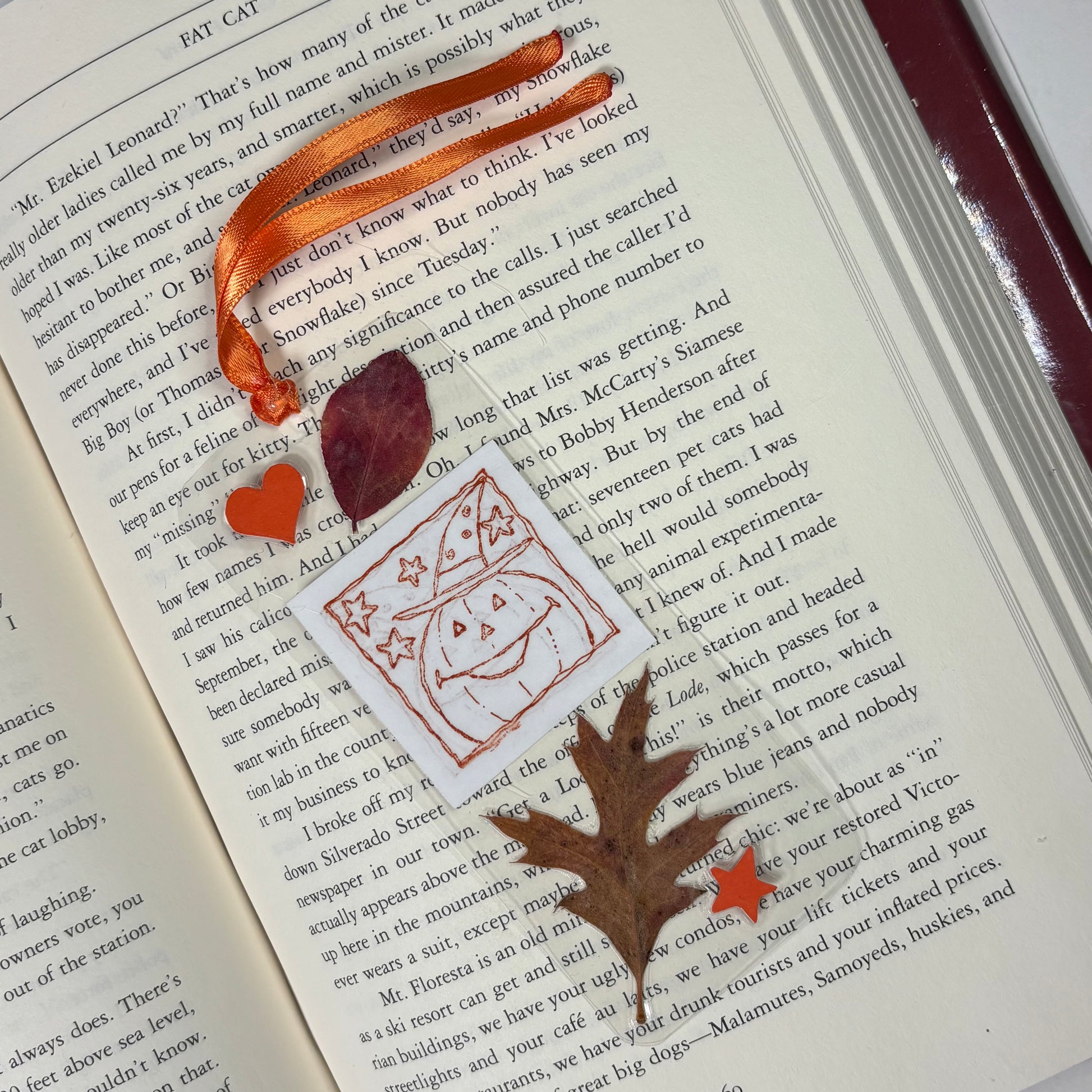 Features an orange heart, a red rounded leaf, a square with an orange stamped square with a pumpkin with a face wearing a witch hat, and four five-point stars on white paper, a brown oak leaf, and an orange five-point star. Finished with an orange ribbon.