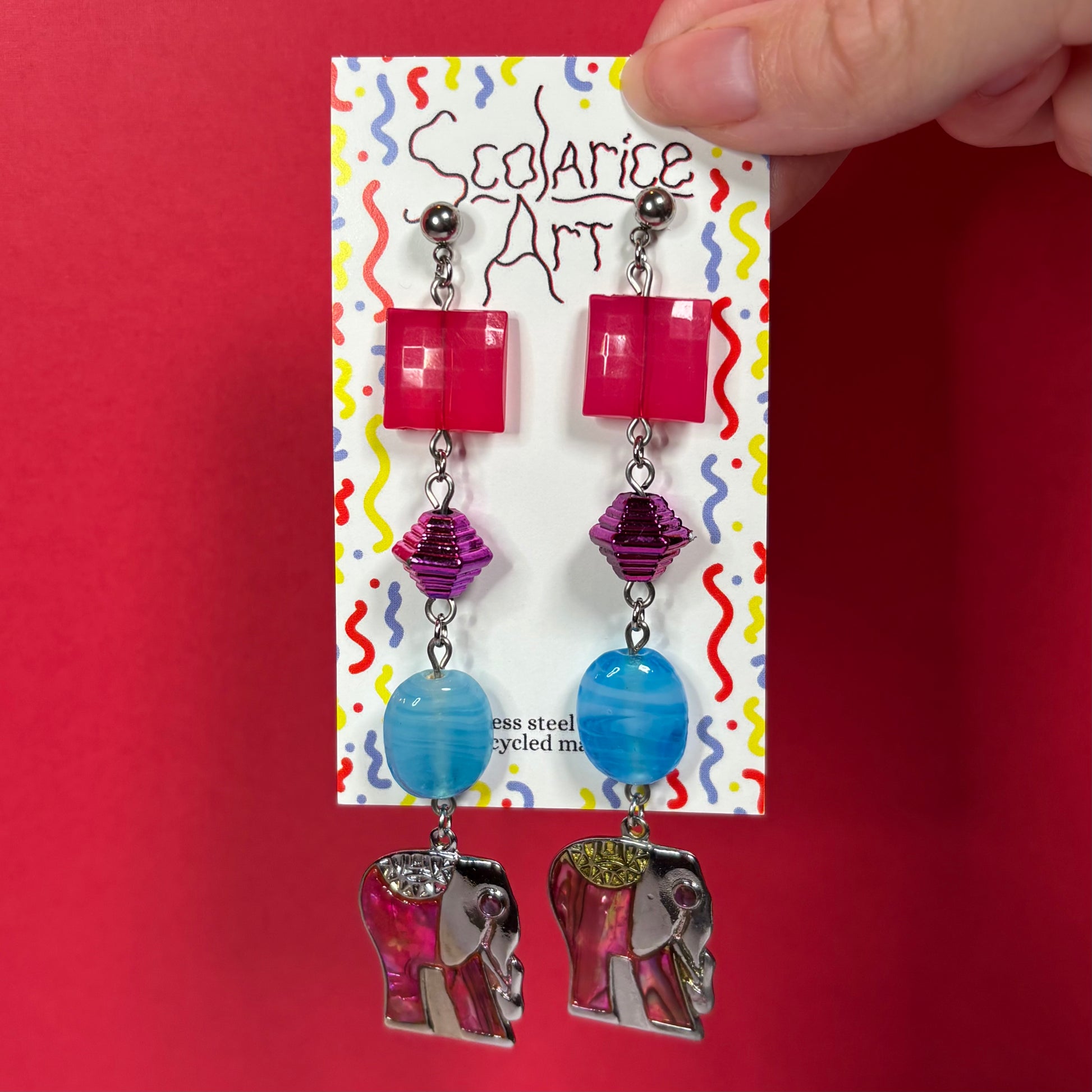 Features a pink flat square bead, a metallic purple textured bicone bead, a blue flat oval bead, and a silver elephant charm with pink enamel details.