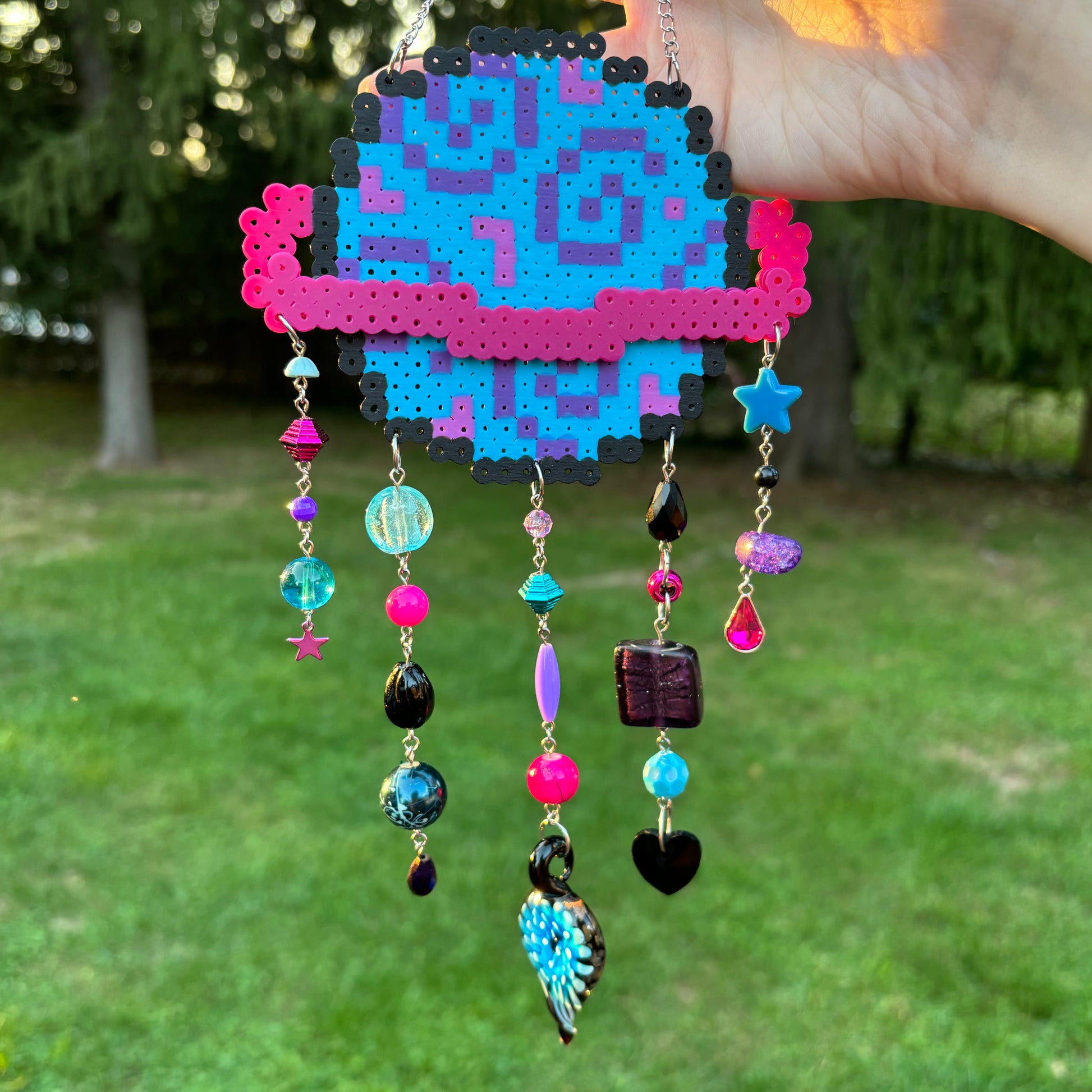 Made of new and reclaimed perler beads, plastic, glass, metal, and stone beads.