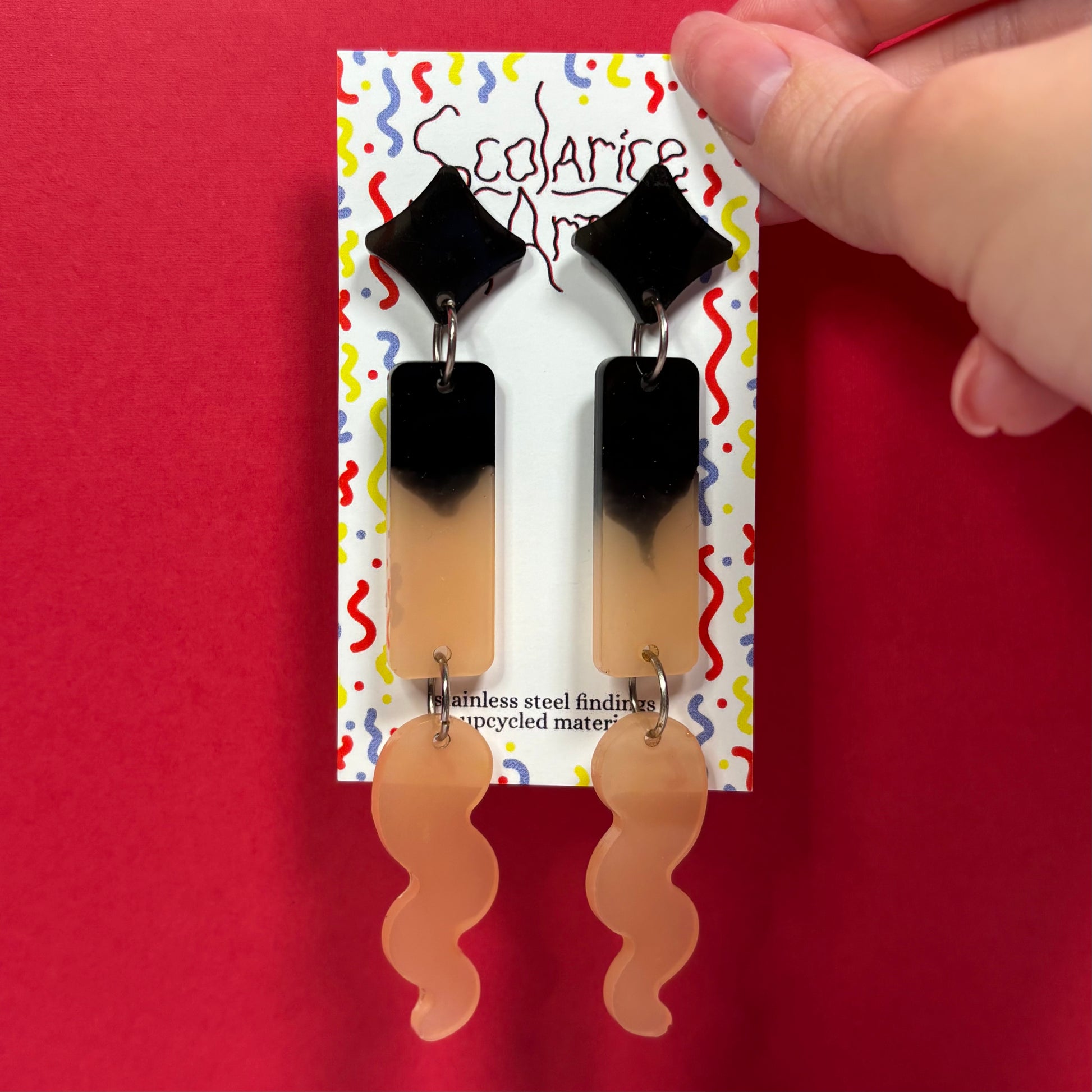 Features a black diamond, a rectangle that goes from black to dusty pink, and a pink squiggle.