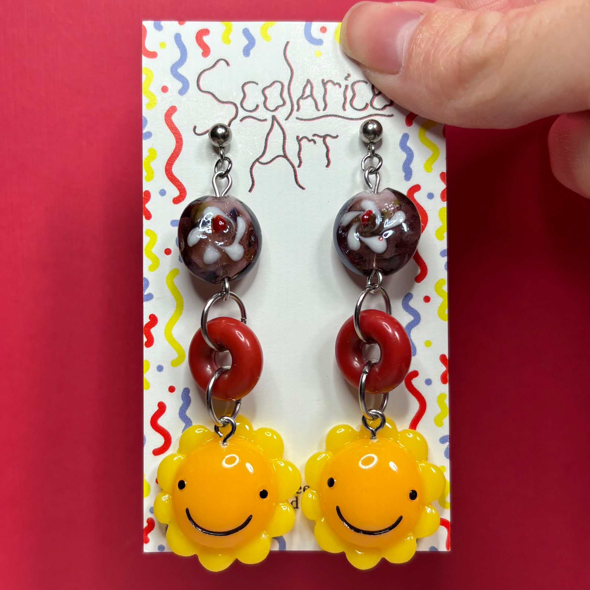 Features a purple flat circle with a white swirl and red dot in the middle, a red donut bead, and a yellow ten-petal flower charm with a large orange center with black dot eyes and a thin black smile.