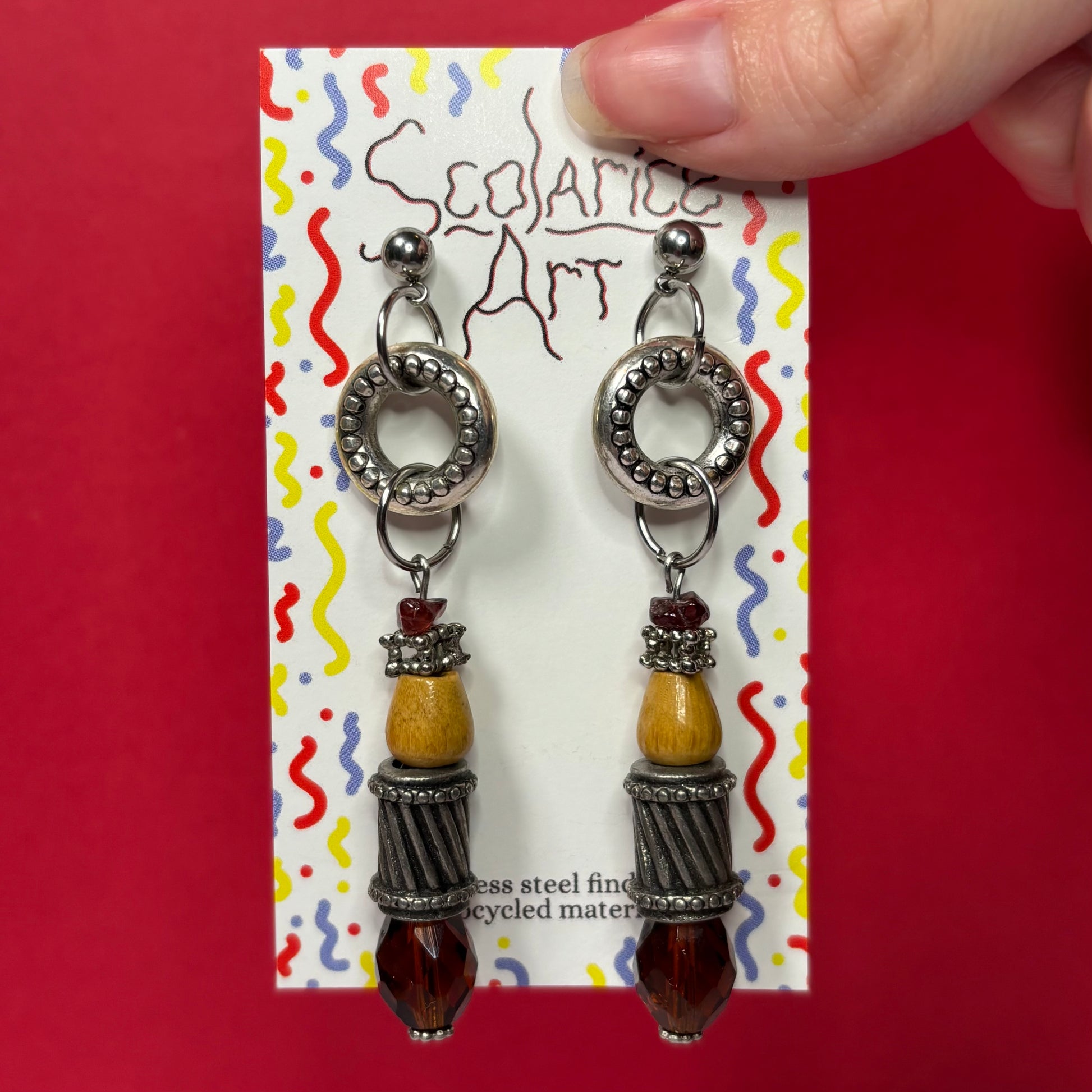 Made of new and reclaimed metal, glass, wood, and plastic beads and charms.