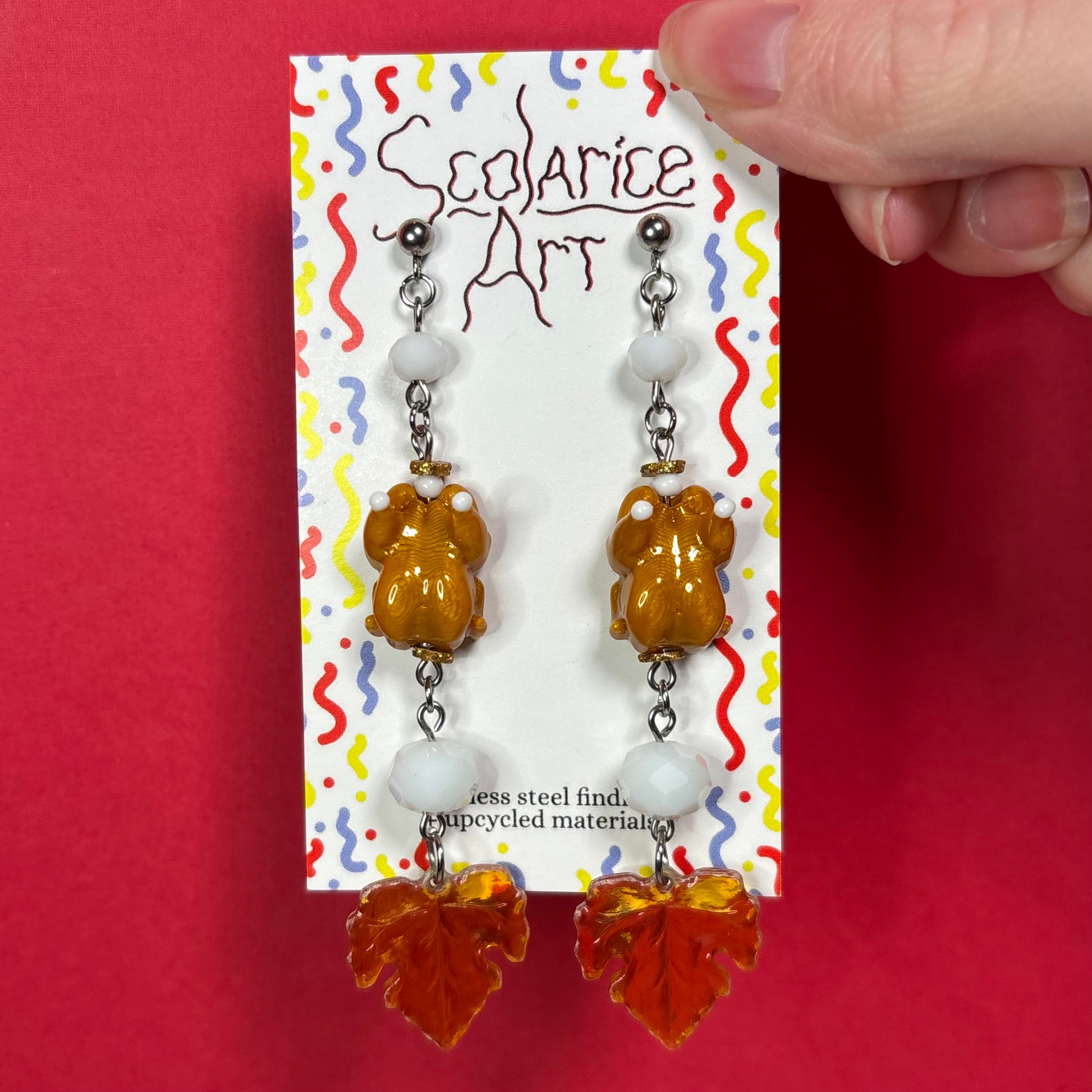 Features a small white faceted rondelle bead, a gold glitter disk bead, a small white round bead, a 3D charm of a brown roast turkey, a gold glitter disk bead, a large white faceted rondelle bead, and a clear yellow-orange leaf charm.
