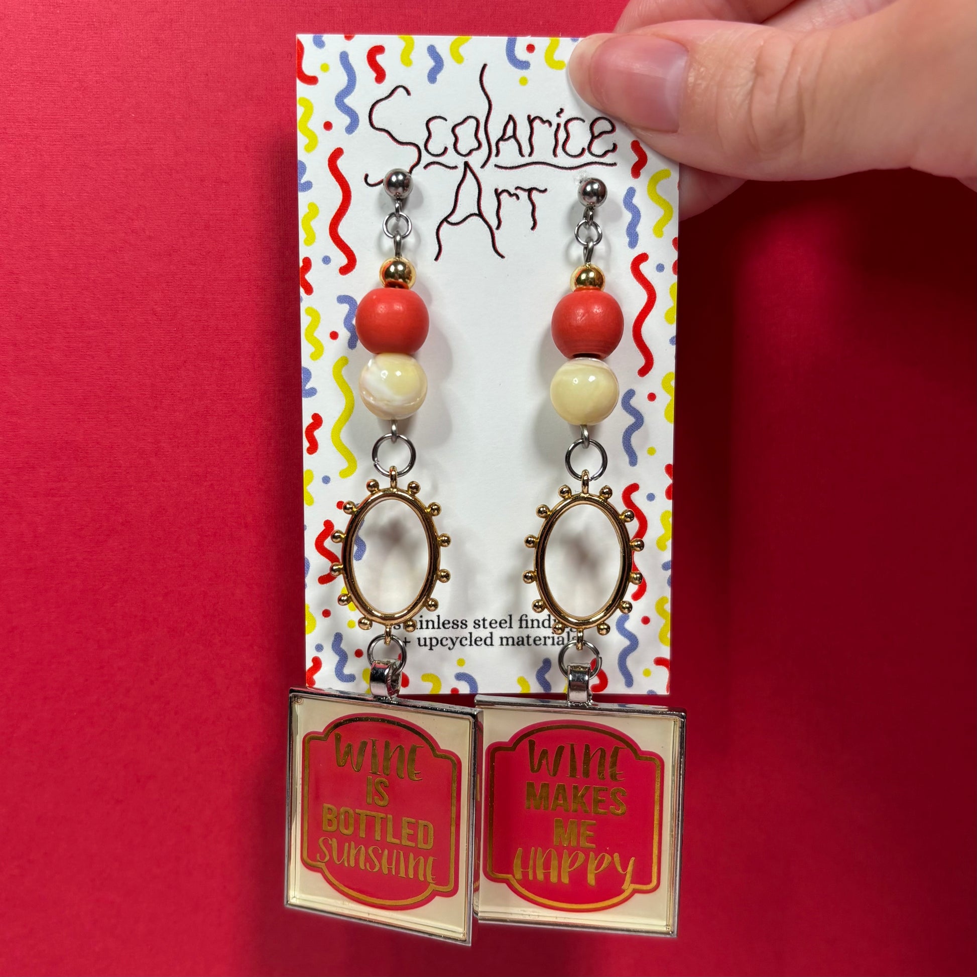 Features a mismatched bead. Both earrings feature a small gold round bead, a red round bead, a shiny cream round bead, a gold ovular sun outline bead, and a flat square charm with a red inside and a cream trim, with gold text inside. One charm says "Wine Is Bottled Sunshine" and one charm says "Wine Makes Me Happy".